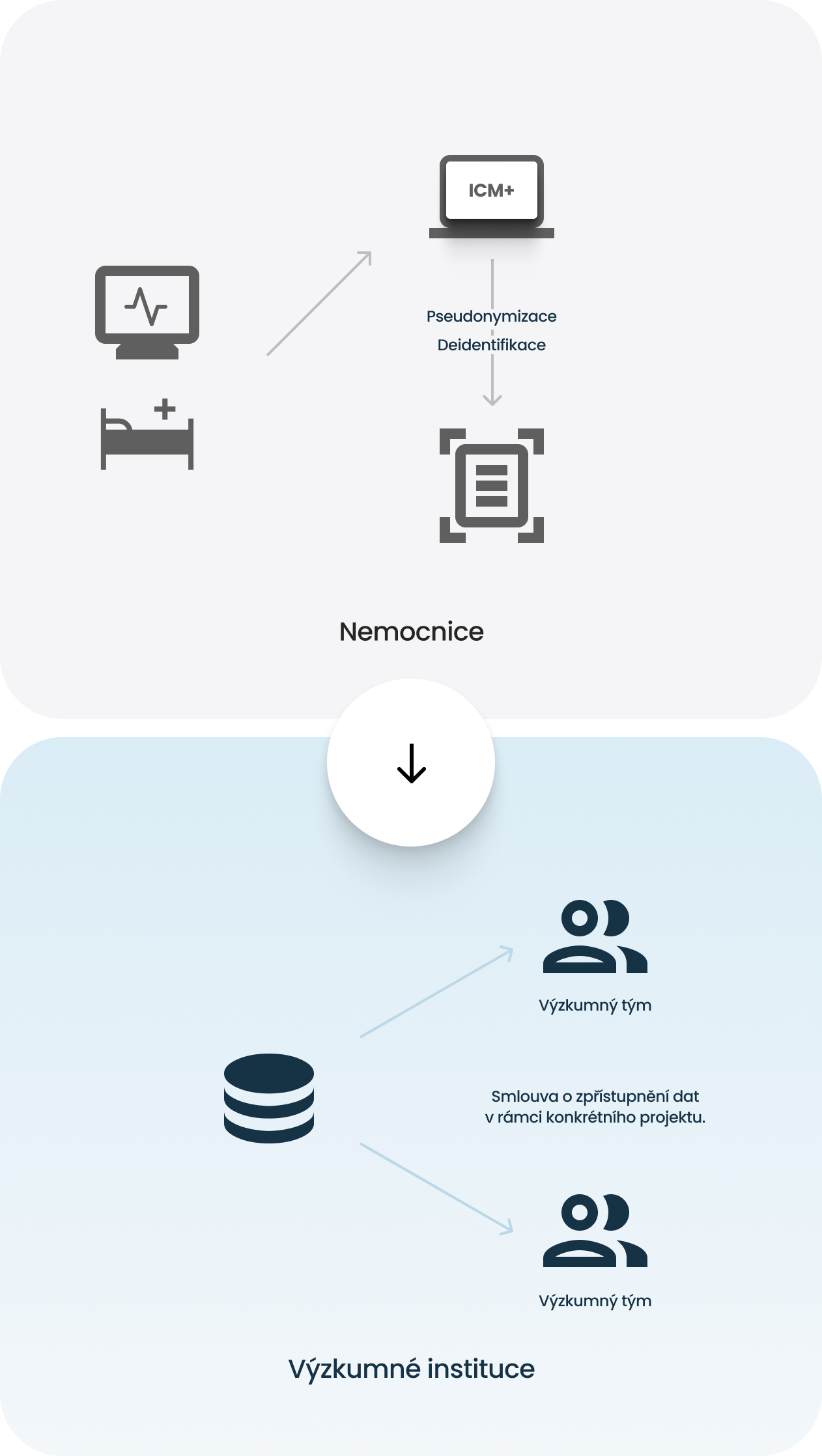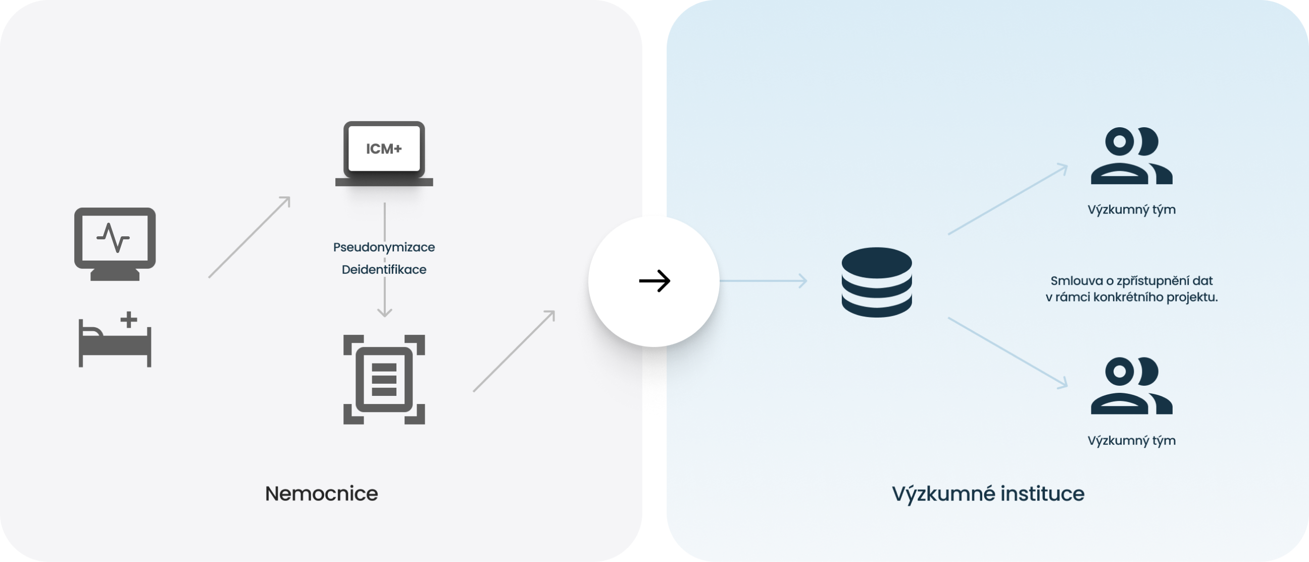 Pro záznam biologických signálů z jednotlivých monitorů využíváme software ICM+ (Cambridge Enterprise Ltd., Spojené království). Po ukončení akvizice dat potom speciální program provede odstranění všech identifikátorů pacienta ze souboru, vygeneruje pseudonymizační klíč a provede jejich odeslání do zabezpečeného cloudového úložiště v ČR. Pseudonymizační klíč zůstává v nemocnici a díky němu je možné v případě potřeby dohledat další informace (například výsledek léčby pacienta).
